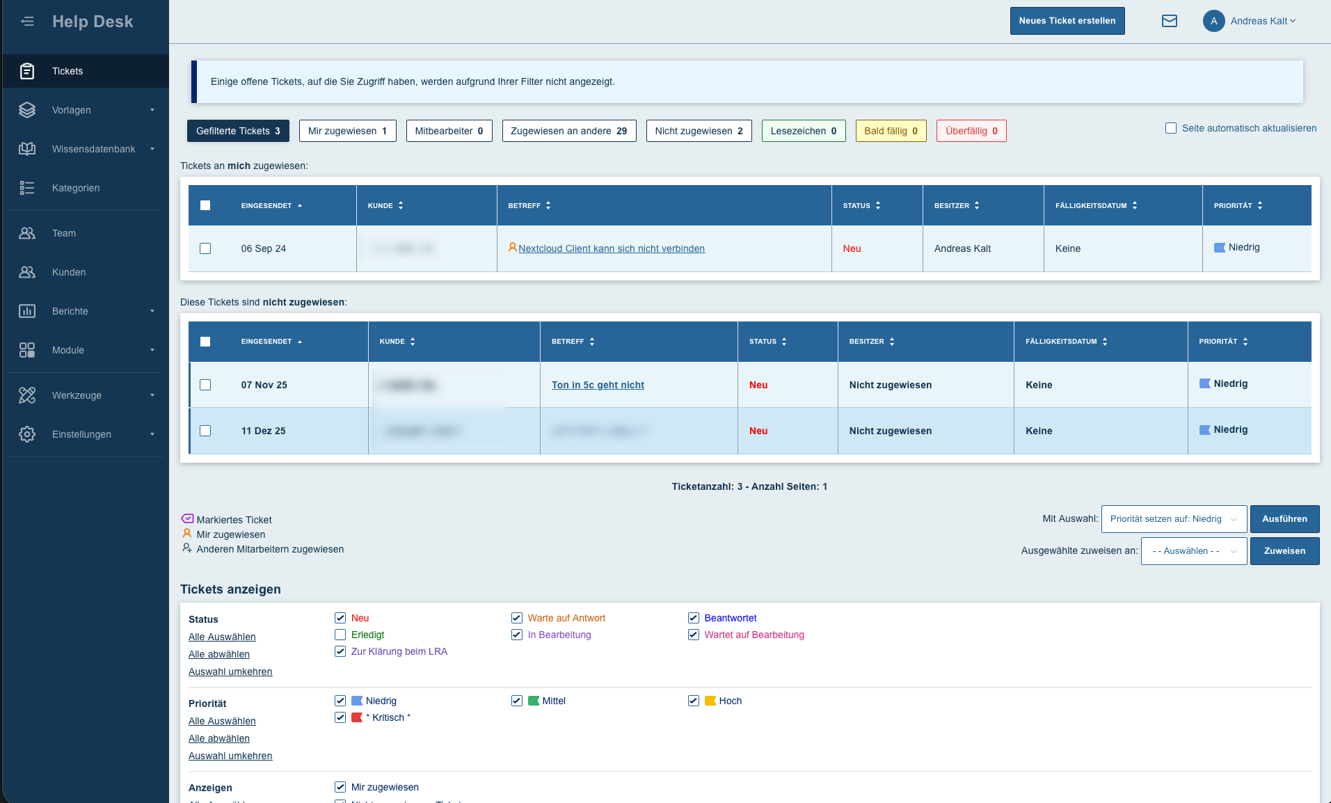 Der Vorteil dieser Abwicklung ist, dass alle offenen Anfragen an zentraler Stelle organisiert werden können. Auch für die Anfragen, die nicht per Mail gestellt werden, erstellen wir in der Regel manuell ein Ticket, sofern die Anfrage nicht innerhalb weniger Minuten erledigt werden kann. So ist immer klar, welche offenen Anfragen es gerade gibt und wer dafür zuständig ist.