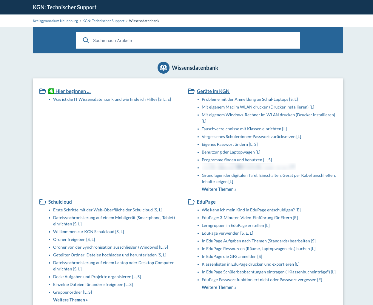 Angeschlossen an das Ticket-System gibt es auch eine Wissensdatenbank, in der wir inzwischen dutzende von Anleitungen geschrieben haben. Wenn also jemand eine Anfrage zu einem Thema schickt, das häufig vorkommt, können wir einfach einen Link zu der Anleitung schicken und müssen uns nicht ständig in den Antworten wiederholen. Die Wissensdatenbank ist öffentlich zugänglich, so dass auch Eltern und Schüler:innen ohne Login darauf zugreifen können.